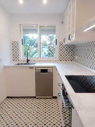 Walking distance to the beach and shopping center. Beach bars, restaurants, and supermarkets. Large terrace, approximately 30 square meters, with unobstructed views. Walking distance to the beach and shopping center. Cafe, restaurants, and beach bars. Also walking distance to your favorite gym, approximately 15 minutes. Corner apartment with a bathroom with a window and a kitchen with a window. Communal pool and garden. Gated community parking. Newly renovated open-plan kitchen. Appliances with invoices. Some furniture is included, also new, but not yet installed. Living room and master bedroom with fireplace. Built-in barbecue on the terrace.